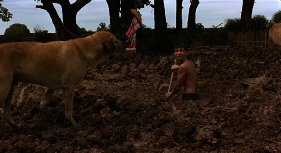 สมัยก่อนผมเคยได้ยินสำนวน ‘ขี้แล้วกลบคือแมว ขี้แล้วแจวคือหมา’ ซึ่งการใส่น้องหมาเข้ามาในช็อตนี้ก็แปลว่า ไอ้แผน=หมาขี้ คือมันปี้เสร็จท้องแล้วก็หนี ซึ่งช่วงท้ายเมื่อทั้งสองหวนกลับมาพบเจอกัน