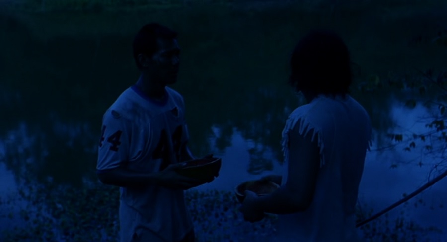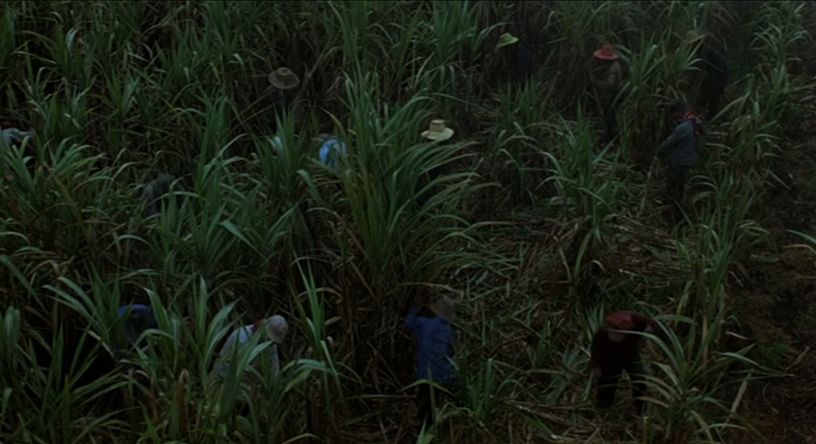 แผน-หยอด สามารถหลบหนีเอาตัวรอดจากหัวหน้าคนงานไร่อ้อย ด้วยการเอากะลาครอบหัว, ทีแรกผมสงสัยมากว่ามันมีสำนวน ‘กะลาครอบหัว’ ด้วยหรือ? คำตอบคือไม่มีนะครับ ที่ถูกคือ กบในกะลาครอบ หมายถึง ผู้มีความรู้ประสบการณ์น้อย เพราะไม่เคยเผชิญโลกกว้าง แต่สำคัญตนว่ามีความรู้มาก … ผมว่ามันก็คือๆกันละมั้ง และการเลือกถ่ายฉากนี้ด้วยโทนสีน้ำเงิน (คงจะด้วยฟิลเลอร์ Day-for-Night) ให้สัมผัสราวกับโลกอีกใบ (โลกในกะลา)