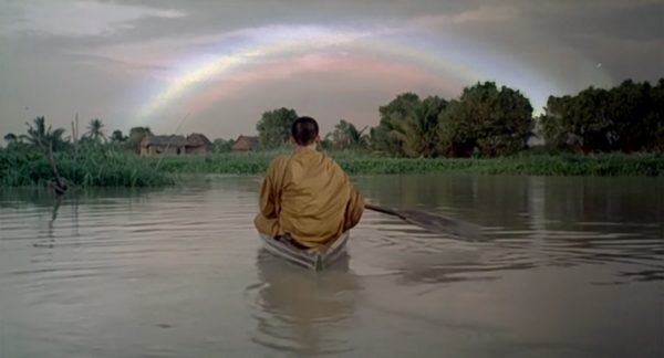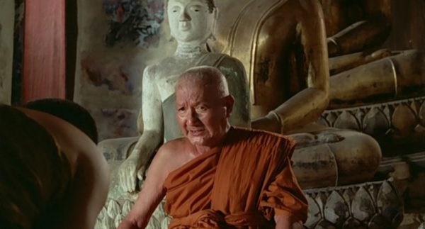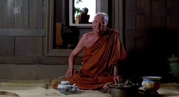 กล้องเคลื่อนจากจานอาหารติดตามมือของสมภาร ล้างเสร็จหยิบผ้าขึ้นเช็ดปาก จากนั้นกล้องซูมออกมาจนถึงช็อตนี้ หลวงปู่นั่งอยู่กำลังสนทนากับอำแดงเหมือน กำลังหว่านล้อมชักแม่น้ำทั้งห้า เพื่อขออนุญาตร่ำเรียนอ่านเขียนหนังสือ