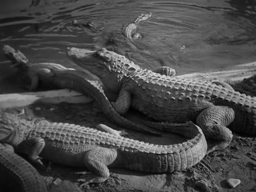 ผมไม่ค่อยแน่ใจนักว่าภาพชายนอนอาบแดด แล้วโบ๊ะผิวสีดำแฝงนัยยะอะไร แต่การตัดไปภาพจระเข้ที่ก็นอนอาบแดดอยู่ริมบ่อน้ำ นั่นคือการเปรียบเทียบอย่างตรงไปตรงมา มนุษย์=จระเข้ สัตว์เลื้อยคลาน เป็นผู้ล่า มีความดุร้าย ชอบล่อหลอกเหยื่อให้ตายใจ จากนั้นฉีกกัดเนื้อหนัง กลืนกินเหยื่อทั้งๆยังมีลมหายใจ (พฤติกรรมของจระเข้ สามารถสะท้อนสันดานธาตุแท้ของคนชนชั้น Upper Class)