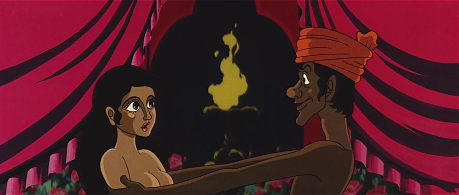 ฉากการร่วมรักระหว่าง Aladdin กับราชินีแห่งเกาะหญิงล้วน มีความโคตรอาร์ทอย่างยิ่ง! ใช้โทนสีชมพูออกม่วง (Pink Film) เคลื่อนไหวด้วยภาพร่างขอบเงา เรือนร่างแขนขาคลอเคลียนัวเนีย แนบนิดชิดเชื้อ จนแทบจะกลายเป็นวัตถุเนื้อเดียวกันแยกเกือบไม่ออก (อะไรแขนอะไรขา)