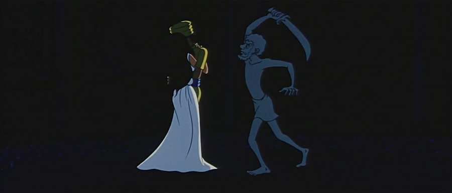 ไดเรคชั่นของฉากนี้ ทั้งสองต่อสู้กันท่ามกลางทะเลสาย พบเห็นสายลมฝุ่นควันดำ(และเสียงลม)พัดผ่าน แทนความหวิวๆรวดร้าวใจของ Aladdin หลังสูญเสียคนรัก ทำออกมามืดๆหม่นๆไม่ค่อยสวยเท่าไหร่แต่นัยยะความหมายใช้ได้ทีเดียว