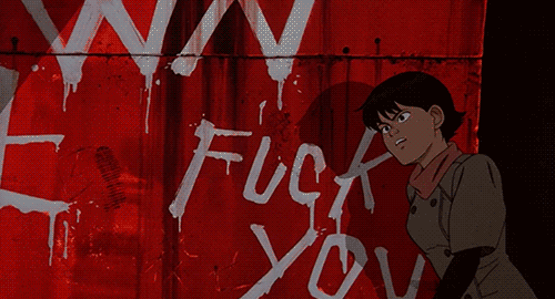 ความยียวนกวนประสาทของผู้กำกับ Otomo พบเห็นหลายครั้งทีเดียวกับการใช้ตัวอักษร (มีทั้งภาษาญี่ปุ่น, อังกฤษ) ปรากฎข้อความเป็นพื้นหลัง เพื่อสะท้อนสิ่งที่เกิดขึ้นกับตัวละครนั้นๆ อย่างช็อตนี้สังเกตเห็นทันกันหรือเปล่า Kei วิ่งผ่านกราฟิตี้ข้างหลัง ‘Clown, Fuck You’ ร้ายกาจจริงๆ