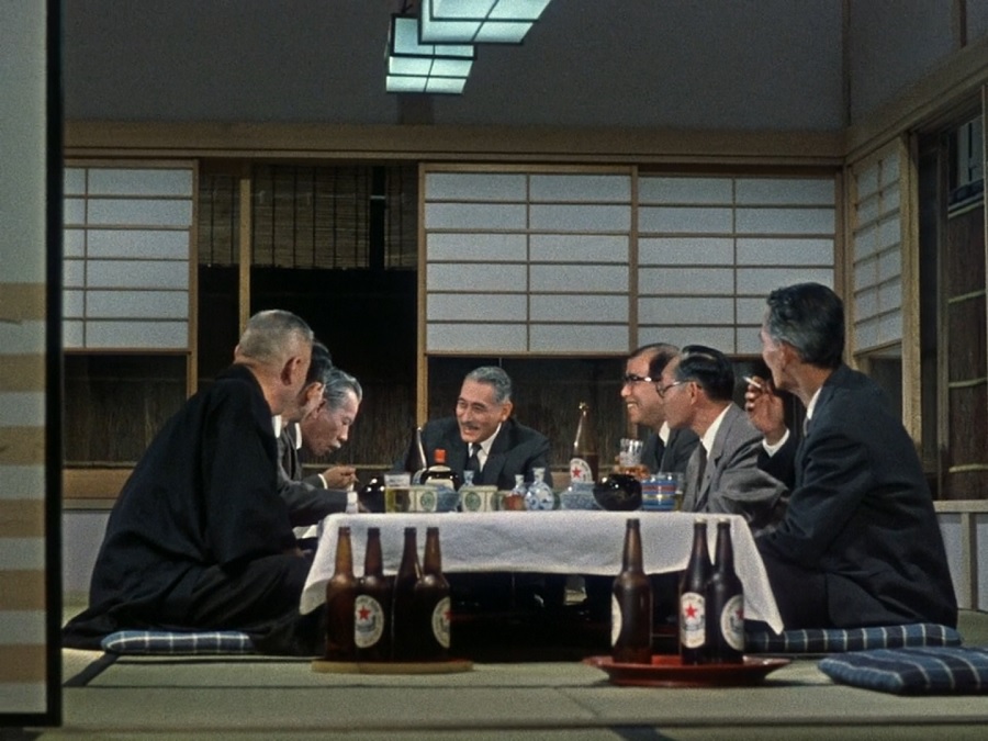 ช็อตลายเซ็นต์ของ Ozu, บุคคลผู้นั่งกึ่งกลางคือประธานในงานเลี้ยงรุ่นครั้งนี้ Shin Horie ถัดมาด้านซ้ายมือคือแขกคนสำคัญสุดในงาน อดีตครูประจำชั้น The Gourd ที่เอาแต่ก้มหน้าก้มตา จกอาหาร สุรา วางกองเรียงรายอยู่ตรงหน้า ขณะที่คนอื่นกำลังพูดคุยสนทนาอย่างออกรสชาติ