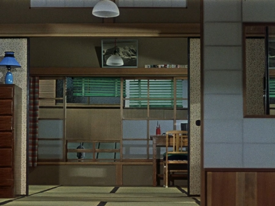 ช็อตถัดมาเป็นอะไรที่ผมพบเห็นแล้วสั่นสะท้านหัวใจมากๆ อยู่ดีๆโทนภาพเกิดการปรับเปลี่ยนแปลง จากเคยสีส้มๆอบอุ่น กลายเป็นน้ำเงินเยือกเย็นเฉียบ (เทียบสีกับภาพด้านบน ย่อมพบเห็นความแตกต่างจัดเจน) นี่คือการจัดโทนแสงสีที่สะท้อนอารมณ์ของเรื่องราว ไม่ค่อยพบเห็นนักในหนังของ Ozu