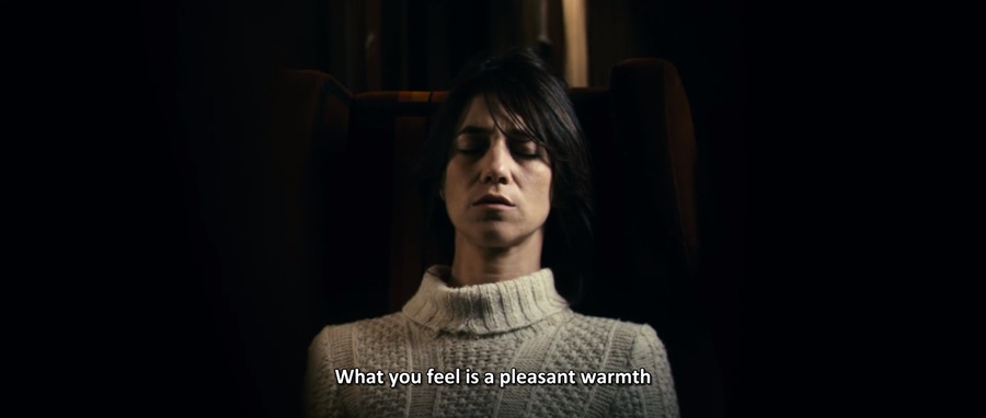 หลายคนอาจมองสิ่งน่ามหัศจรรย์สุดของหนังคือภาพถ่ายซุปเปอร์สโลโมชั่น แต่ผมประทับใจลีลาการสะกดจิต เริ่มต้นด้วยถ่ายส่ายๆสั่นๆตามแบบปกติ (ด้วยกล้อง Hand Held) แต่พอหญิงสาวหลับตา สามีเริ่มพูดนำทาง ราวกับกล้องวางลงบนขาตั้ง บังเกิดความสงบสติอารมณ์ ทุกสิ่งอย่างแน่นิ่ง จากนั้นค่อยๆซูมเข้าหาใบหน้า ดวงตา