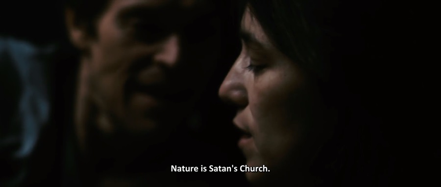 หลังจากหญิงสาวสงบสติอารมณ์ ค่ำคืนนี้เธอจึงพูดอธิบายความครุ่นคิด ข้อสรุปที่ได้รับจากการทำวิจัยเมื่อปีก่อน “Nature is Satan’s Church” เสียงลูกโอ๊กที่ตกหล่นคือสัญลักษณ์ความตาย สิ่งสวยงามอย่างสวน Eden แท้จริงแล้วอาจมีความอัปลักษณ์พิศดาร … แสดงถึงโลกทัศน์ของเธอที่กลับตารปัตรตรงกันข้าม
