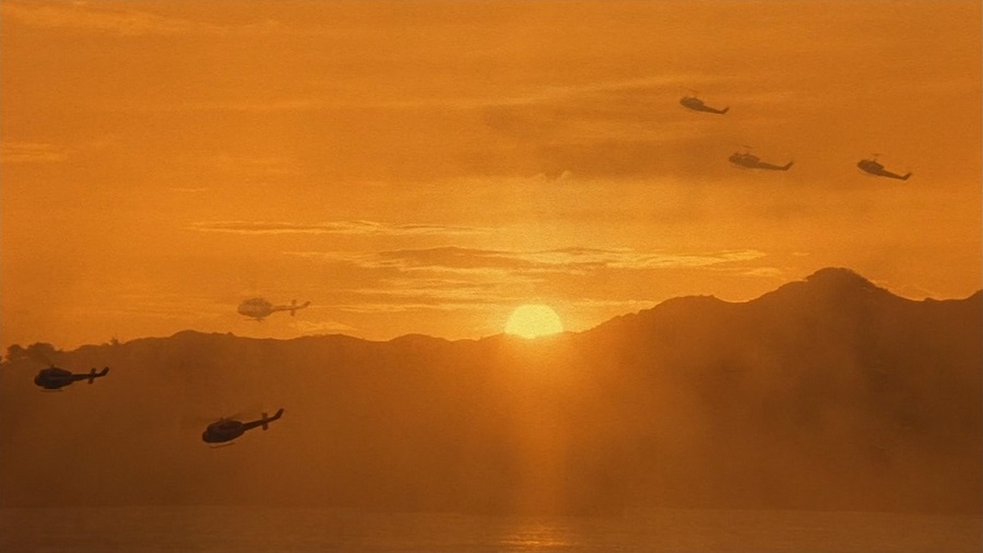 ช็อตสวยงามที่สุดของหนัง ภาพเฮลิคอปเตอร์บินเรียงหน้ากระดานเข้าหาพระอาทิตย์ขึ้นยามเช้า, ผมยกให้ช็อตนี้งดงามเป็นรองเพียงพระอาทิตย์โผล่ขึ้นจากขอบฟ้า ของหนังเรื่อง Lawrence of Arabia (1962)