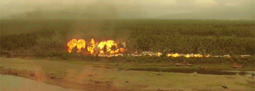 ฉากระเบิดต้นปาล์มนั่นของจริงไม่มีหลอก เตรียมการด้วยน้ำมันเบนซินกว่าสองร้อยแกลลอน ร่วมกับยางรถยนต์ (เพื่อให้เกิดควันโพยพุ่ง) เครื่องบินทิ้งระเบิดและเฮลิคอปเตอร์แค่โฉบผ่านเท่านั้น ระเบิดจุดจากด้านล่างภาคพื้นดิน เทคเดียวผ่านไม่งั้นสิ้นเปลืองงบประมาณเกิน (และคงปลูกป่าปาล์มใหม่ไม่ไหวแน่)