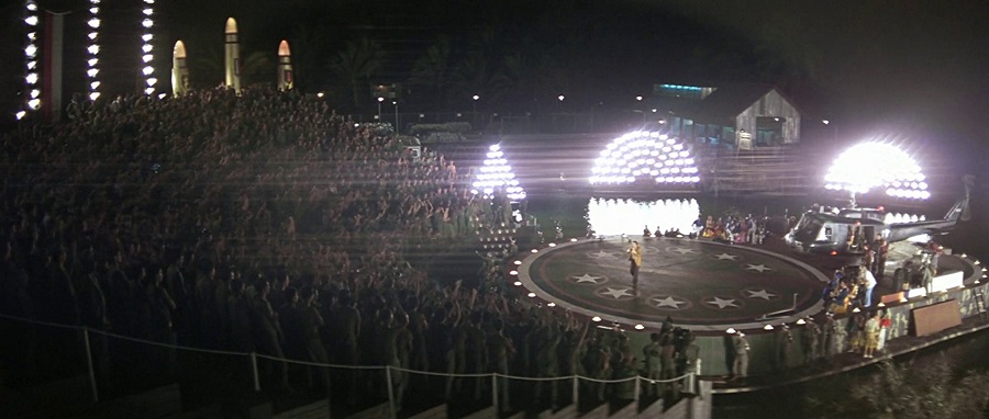 – ภาพระเบิดต้นปาล์มยังคงพบเห็นได้ลางๆ เห็นเปลวเพลงและเฮลิคอปเตอร์เคลื่อนผ่าน