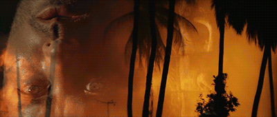 – ไฟลุกท่วมต้นปาล์ม แทนสัญลักษณ์ของสิ่งชั่วร้าย/ความรุนแรง ที่หลบซ่อนอยู่ในจิตใจ