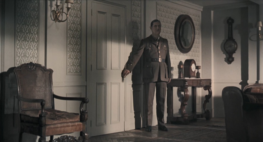 สองช็อตคือการหันซ้ายขวาของ Philippe Gerbier ภาพแรกเห็นทหารเยอรมันประจำอยู่ตำแหน่งปืนกล (ราวกับผู้ชม)