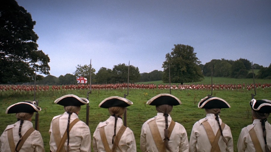 แม้ว่าผกก. Kubrick จะมีประสบการณ์จาก Spartacus (1960) แต่วิธีการนำเสนอฉากสู้รบสงครามกลับแตกต่างออกไปโดยสิ้นเชิง! ไม่มีช็อตมุมสูง/เบื้องบนก้มลงมา นั่นเพราะหนังนำเสนอผ่านมุมมอง Redmond Barry ซึ่งเป็นผู้เข้าร่วม ส่วนหนึ่งของกองทัพ จึงพบเห็นขณะกรีธาทัพ รับกระสุนปืน ก้าวย่างสู่เกียรติยศความตาย… ชวนให้นึกถึงภาพยนตร์ Paths of Glory (1957)