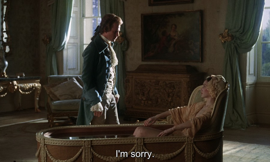 ความน่าสนใจของซีนนี้คือการเลือกสถานที่ในห้องอาบน้ำ เรือนร่างของ Lady Lyndon เปลือยอยู่ครึ่งท่อน จึงไม่สามารถลุกขึ้นมาโต้ตอบ พูดบอก แสดงออกใดๆ เพียงยื่นมือมาให้จับ แล้วเขาโน้มตัวลงจุมพิต … บทกวีฝรั่งเศสก่อนหน้านี้ อาจคือคำอธิบายเหตุผลที่ทำให้เธอยินยอมยกโทษให้อภัย
