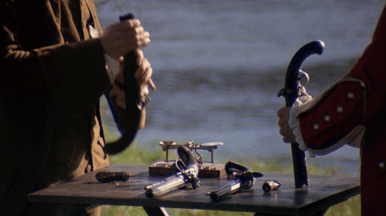 ภาพแรกของหนังคือการดวลปืน สัญลักษณ์การต่อสู้ของสุภาพบุรุษ ลูกผู้ชาย ตามวิถีชนชั้นสูงสมัยก่อน เพื่อเป็นการรักษาเกียรติ ศักดิ์ศรี หน้าตาของตนเอง (และวงศ์ตระกูล) จะว่าไปแทบไม่แตกต่างกับการสู้รบสงคราม สองประเทศสรรหาข้ออ้างในการต่อสู้ ยึดครอง กำจัดศัตรูให้พ้นภัยทาง … ลักษณะของปืนที่มีกระบอกยาวๆ ยังมักถูกมองในเชิงสัญญะของลึงค์ องคชาติ อวัยวะเพศชาย (Phallic) ปลดปล่อยกระสุน อวดอ้างอำนาจ/บารมี ฉันมีความยิ่งใหญ่กว่า