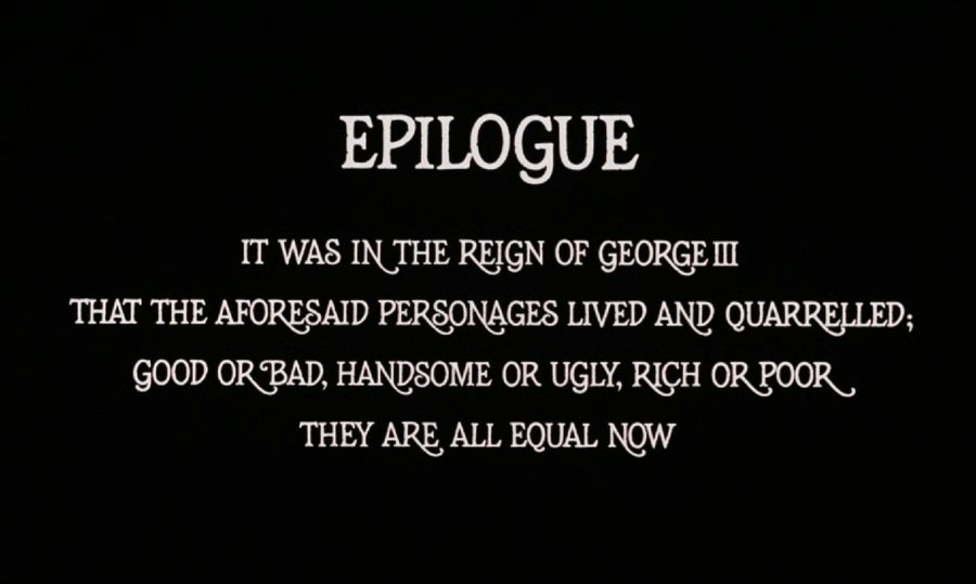 นี่คงต้องย้อนกลับไปอ่านป้าย Part I และ Part II ก็ค้นพบว่าเกี่ยวกับการไต่เต้าจากบุคคลธรรมดา Redmond Barry สู่การเป็น Redmond Barry (Lyndon) พยายามทำทุกสิ่งอย่างเพื่อให้ได้เป็นขุนนาง แต่กลับประสบความล้มเหลว ปัจฉิมบทคงคือคำปลอบใจ ในยุคสมัย King George III ระบบชนชั้นทางสังคมใกล้ถึงจุดล่มสลาย … แต่มันก็เฉพาะการเลิกทาสอย่างเดียวนะครับ พวกขุนนางก็คงระเริงรื่นในอำนาจไปอีกเป็นศตวรรษ!
