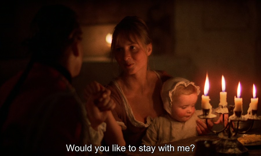 ระหว่างการหลบหนีของ Redmond Barry พบเจอกับหญิงสาวชาวเยอรมัน ใช้ชีวิตอยู่ตามลำพังกับทารกน้อย สามีไม่รู้เป็นตายร้ายดี ค่ำคืนนี้ชักชวนเขามาค้างคืน ร่วมรักหลับนอน, หลายคนอาจครุ่นคิดว่านี่เป็นฉากที่ไม่จำเป็นสักเท่าไหร่ แต่ผมมองว่าเป็นซีเควนซ์สำคัญมากๆ เพราะสามารถสื่อถึงโลกใบนี้ยังมีสิ่งสวยๆงามๆหลงเหลืออยู่บ้าง ไม่ได้มืดหม่นสิ้นหวังตลอดการเดินทาง