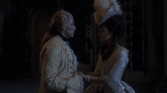 Barry and Lady Lyndon sit at the gaming table and exchange lingering looks. They do not say a word. Lady Lyndon goes out on the balcony for some air. Barry follows her outside. They gaze longingly into each other’s eyes and kiss. Still not a word is spoken. It’s very romantic, but at the same time, I think it suggests the empty attraction they have for each other that is to disappear as quickly as it arose. It sets the stage for everything that is to follow in their relationship. The actors, the images and the Schubert worked well together, I think.