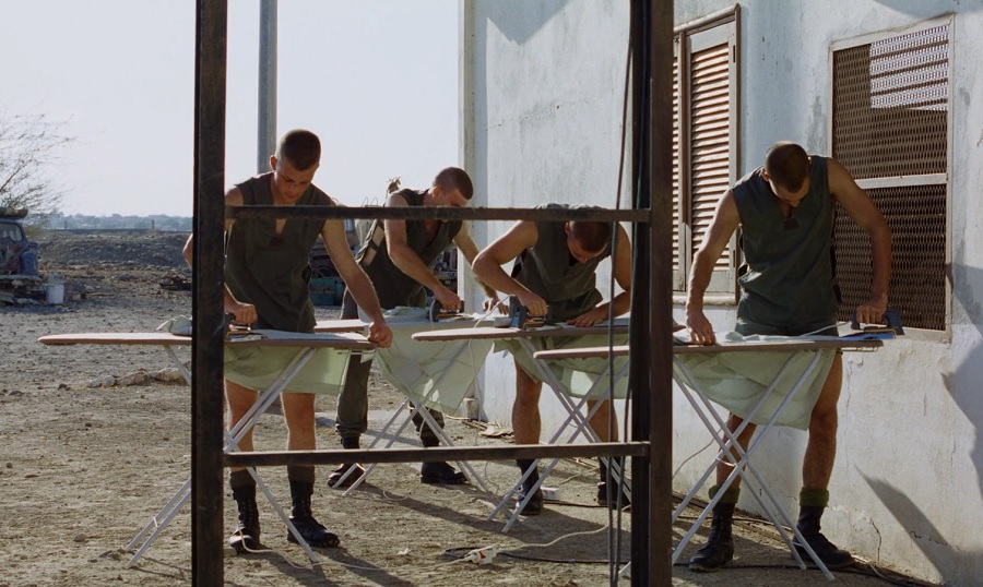 the film’s legionnaires are coded feminine as much as they are masculine. Some of the most memorable scenes show them performing everyday domestic tasks such as ironing, hanging up washing, or peeling potatoes. Even the military exercises are often tinged with an unexpected femininity since they were designed by a ballet choreographer.