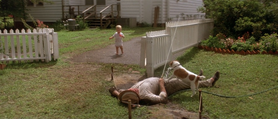 การจัดวางองค์ประกอบของช็อตนี้ ดูละม้ายคล้ายภาพวาดงานศิลปะของ Francis Bacon โดยเฉพาะเส้นเชือกขีงเป็นพื้นที่สี่เหลี่ยม (นั่นคือหนี่งในลายเซ็นของ Bacon เลยนะ!) เพื่อสร้างจุดศูนย์กลาง ตำแหน่งความสนใจ แล้วห้อมล้อมรายละเอียดรอบข้าง เด็กน้อยเดินเข้ามา และสุนัขเล่นกับสายฉีดน้ำ (วางตรงอวัยวะเพศพอดิบพอดี)