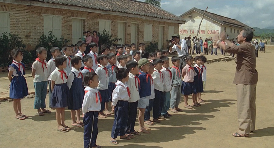 ระหว่างที่เด็กๆกำลังขับร้องเพลงสรรเสริญลุงโฮจิมินห์ (ไม่ได้มีความแตกต่างจากประธานเหมาเจ๋อตุงเลยนะ!) ช่างภาพชาวญี่ปุ่น Akutagawa ก็พูดประโยคแรกของหนัง “Don’t look at the camera”. นี่ไม่ใช่แค่คำบอกกล่าวเด็กๆ อย่าหันมาสบตาหน้ากล้อง เดี๋ยวภาพถ่ายออกมาไม่สวย แต่ยังคือคำสนทนา/ท้าทายผู้ชม เพราะการสั่งห้ามมักทำให้มนุษย์เกิดความอยากรู้อยากเห็น ต้องการจับจ้องมอง (เสือกเรื่องราวบ้าน) รับรู้ให้ได้ว่าภาพยนตร์นี้กำลังจะนำเสนออะไร