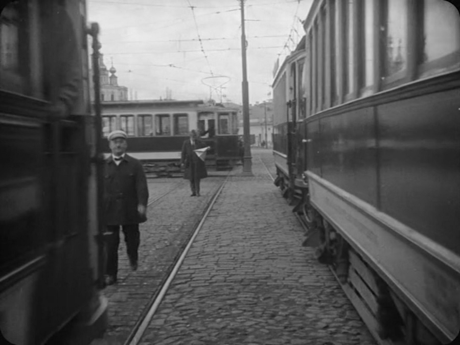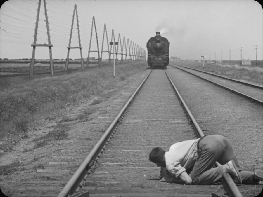 ฉากเสียวสันหลังวาบของรถไฟ ก็เห็นผู้กำกับ Vertov เริ่มเล่นมาเมื่อครั้น Kino-Glaz (1924) แต่เรื่องนี้พัฒนายกระดับไปอีกขั้น ด้วยการตัดต่อที่รวดเร็วฉับไว ขยับโยกกล้องเอียงกระเท่เร่ไปมาด้านข้างรถไฟ แถมมีช็อตขาตัวละครเดินสะดุดราง … แต่ก็ไม่ได้แฝงนัยยะความหมายอะไรซ่อนเร้น