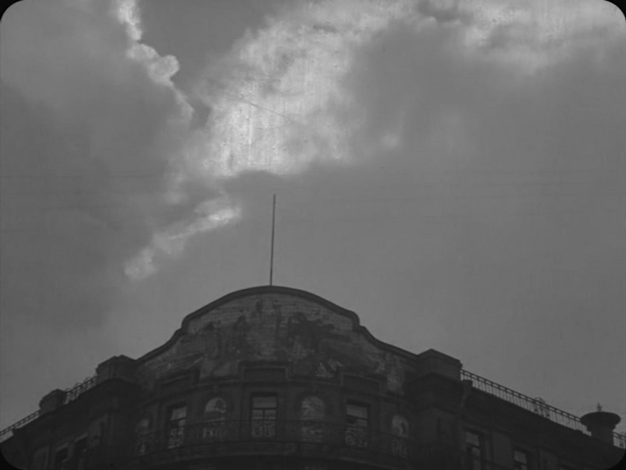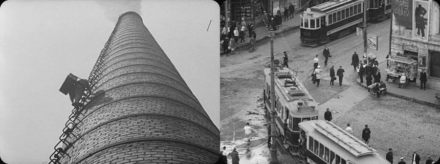 ซึ่งภาพแรกที่ตัวละครตากล้องถ่ายออกมา มุมเงยขึ้นสูงเห็นท้องฟากฟ้า เมฆหมอกปลกคลุม เคลื่อนผ่านโดยไวด้วยเทคนิค Fast-Motion นี่เรียกได้ว่าเป็นความทะเยอทะยานของผู้กำกับ Vertov เพื่อค้นหามุมมอง ‘ความจริง’ ที่สามารถปรากฎอยู่ฟีล์มในภาพยนตร์