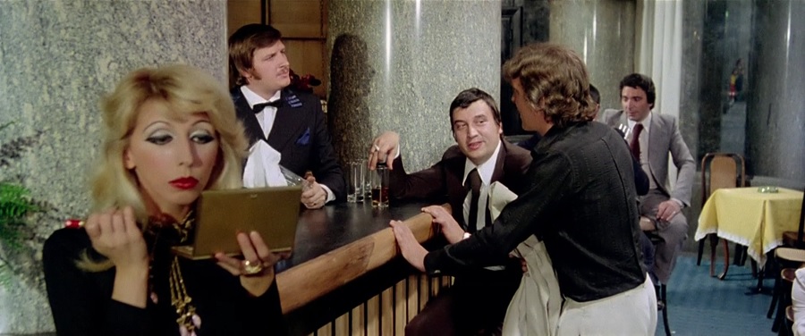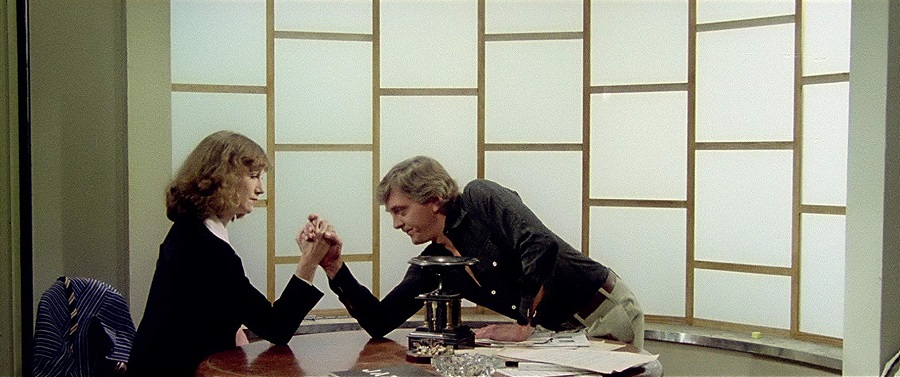แต่เท่าที่ผมสังเกตดู อย่างหญิงสาวที่กำลังแต่งหน้าด้านซ้ายมือนี้ ตัวละครเด่นๆในหลายๆช็อต มักมีความเป็นเอกเทศ ‘Individual’ ตัวคนเดียวแบบไม่ค่อยสุงสิงกับใคร อารมณ์เหงาๆเปล่าเปลี่ยว เฝ้ารอคอยบางสิ่งอย่าง … นี่อาจสะท้อนโลกอนาคตในจินตนาการของผู้กำกับ Argento ที่กำลังมุ่งสู่ความเป็นปัจเจกบุคคล ตัวใครตัวมัน มักไม่ค่อยพึ่งพิงพาต่อใคร (ก็ตอนที่หญิงสาวกรีดร้องต้นเรื่อง แทบไม่มีใครอยากสนใจเหลียวแล แหงนมองดู ให้ความช่วยเหลือ เป็นโลกที่มีความส่วนตัวสูงมากๆ)