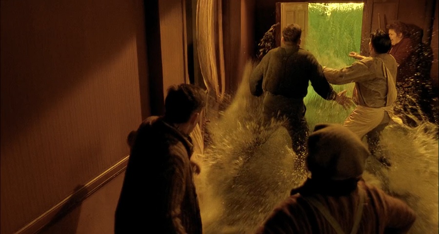 ฉากนี้ก็น่าจะได้แรงบันดาลใจจาก The Shining (1980) เปลี่ยนจากเลือดไหลนอง (สื่อถึงจิตวิญญาณที่แตกสลาย) กลายมาเป็นน้ำท่วมอพาร์ทเม้นท์ (สัญลักษณ์ของความเก็บกด อึดอัดอั้นที่ซ่อนไว้ภายใน) เมื่อเปิดประตู เขื่อนแตก ระบายออก ก็ทำให้ทุกสิ่งอย่างล่มจม พัดพาสิ่งชั่วร้ายให้ไหลลงไปตามกระแสธารา