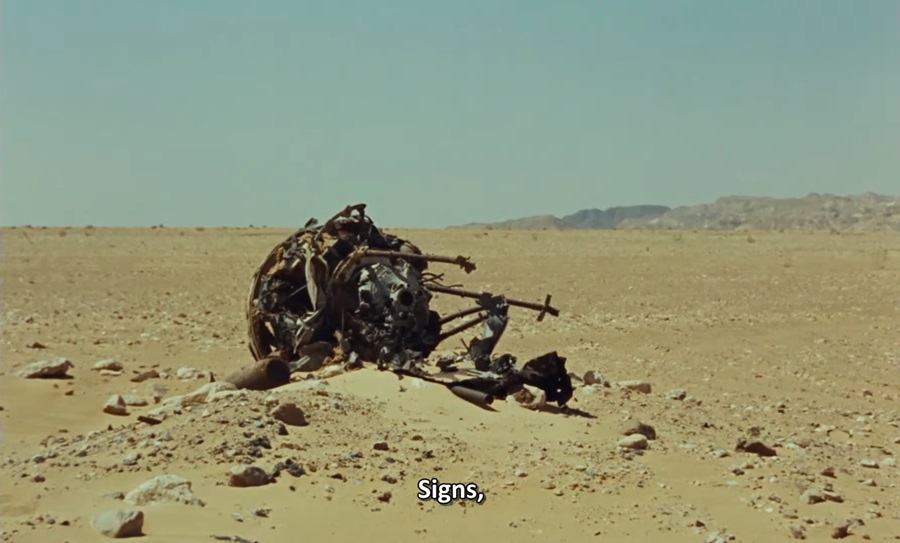 เกร็ด: เมื่อตอนผู้บรรยายเอ่ยคำแรก ‘Sign’ ลองย้อนไปดูรูปที่แคปมา มันไม่ได้มีป้าย เครื่องหมาย สัญลักษณ์อะไรเลย แต่เป็นเศษซากปรักหักพังอะไรสักอย่าง (เครื่องยนต์กลไก?) ท่ามกลางทะเลทราย นี่ชัดเจนมากๆถึงสัญญะลางบอกเหตุร้าย