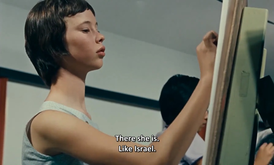ซีเควนซ์สุดท้ายของหนัง เริ่มจากร้อยเรียงภาพถ่ายเด็กๆ จากนั้นพบเห็นเด็กชาย & เด็กหญิงวาดภาพอะไรไม่รู้ แต่เมื่อเสียงบรรยายพูดบอกว่า “There she is. Like Israel.” นี่เป็นการเปรียบเทียบ เด็กหญิง = โฉมหน้าประเทศ Israel (National Identity) ต่างอายุประมาณ 11-12 พอๆกัน และกำลังวาดภาพอนาคตด้วยมือของตนเอง!