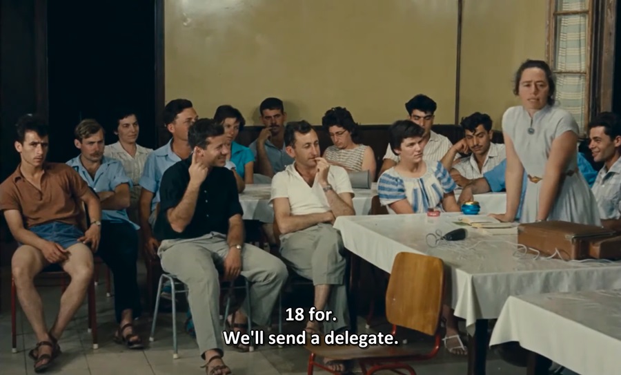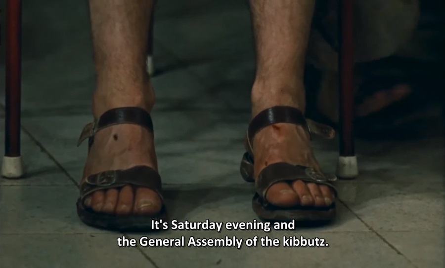 มันมีร้อยแปดพันมุมกล้องที่สามารถเลือกเป็น ‘Establishing Shot’ สำหรับการประชุมเย็นวันเสาร์ แต่ผกก. Marker กลับใช้ภาพที่ถือเป็น ‘Signs’ ถ่ายติดเท้าของหนึ่งในผู้เข้าร่วมประชม แต่นี่ไม่ใช่อารัมบทหายนะของการประชุม (สามารถผ่านการลงมติเลือกตัวแทน ลุล่วงโดยดี) คาดว่าน่าจะต้องการสื่อถึงวิถีประชาธิปไตยใน Israel มันจะยังคงความบริสุทธิ์ ไม่มีผลประโยชน์เคลือบแอบแฝงได้อีกนานเท่าไหร่? “How long will their purity last?”