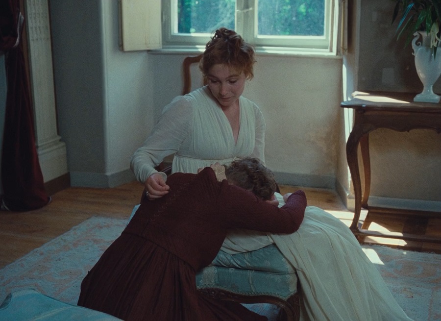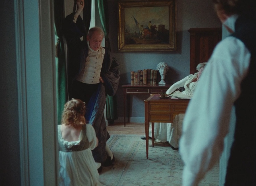 หลายๆช็อตฉากหนังมีความพยายามจัดองค์ประกอบ ‘recreate’ เลียนแบบภาพวาดงานศิลปะ อย่างช็อตนี้ระหว่างที่ Marquise of O กำลังตกอยู่ในภาวะผวา (Shell Shock) ยังไม่ได้สติหวนกลับคืนมาหลังเหตุการณ์โดนฉุดกระชาก ซึ่งเมื่อ Count F. เข้ามาพบเห็น ก็มิอาจควบคุมกิเลสตัณหา … หนังพยายามชี้นำอย่างชัดเจนเลยว่า Count F. (ที่ก่อนหน้านี้เป็นวีรบุรุษ)กลายมาเป็นผู้ข่มขืน Marquise of O จนตั้งครรภ์