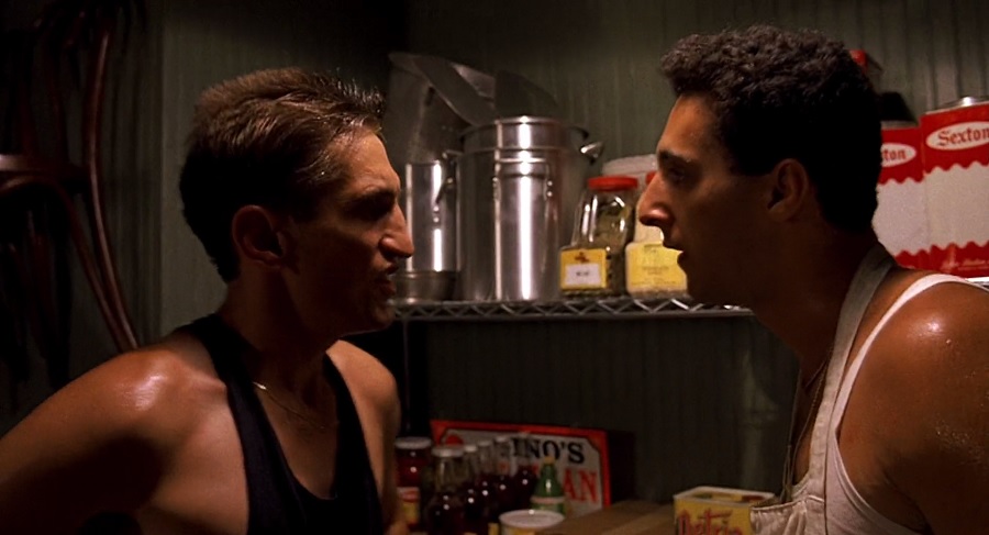 ไดเรคชั่นฉากนี้ค่อนข้างเจ๋งเลยละ, สองพี่น้อง Pino กับ Vito พูดคุยโต้เถียงชกต่อยกันในห้องเก็บของ ถ่ายด้วยกล้อง Hand Held ภาพสั่นๆ หลอดไฟดวงเดียวหมุนโคลงเคลง ทั้ง Turturro และ Edson ต่างโยกเยกตัวไปมาเหมือนนักมวย สะท้อนถึงความลุ่มร้อนใจของทั้งคู่