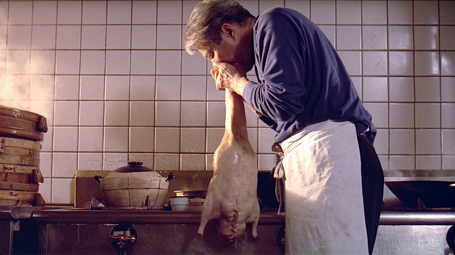 Eat Drink Man Woman (1994) อาจไม่ได้ตั้งใจให้ตลกขบขันเทียบเท่า The Wedding Banquet (1993) แต่หลายๆฉากก็พยายามสร้างบรรยากาศผ่อนคลาย ด้วยไดเรคชั่นอันเฉียบคายของผู้กำกับอังลี่ สามารถเรียกเสียงหัวเราะหึๆอย่างยียวนกวนบท (สำหรับคนที่สามารถเข้าใจ) ยกตัวอย่างหลังฉากร่วมรักระหว่างเจียเชี่ยนกับแฟนหนุ่ม ตัดมาภาพเหลาจูกำลังเป่าลมเข้าท้องไก่ แล้วเอาน้ำมัดมาราดๆลำดัว ก่อนนำลงทอดในกระทะ … คงไม่ต้องอธิบายหรอกนะ