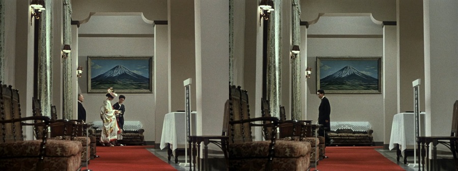 ความคมกริบในไดเรคชั่นตัดต่อ ‘สไตล์ Ozu’ จะมีการแบ่งเรื่องราวออกเห็นตอนๆ ทุก Sequence จะมีนำเข้า-ออก ในลักษณะเป็นวนรอบ เริ่มต้นด้วย Establish Shot และมักจบฉากด้วยภาพลักษณะเดิม (แบบมีอะไรเปลี่ยนแปลงต่างออกไปนิดหน่อย), สังเกตง่ายๆกับฉากงานแต่งงาน เริ่มต้นคู่บ่าวสาวและครอบครัวจะเดินผ่านห้องโถงจากซ้ายไปขวา และช็อตสุดท้ายของ Sequence ผู้เข้าร่วมงานเดินกลับจากขวาไปซ้าย