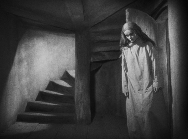 สังเกต: ข้างหลังช็อตนี้เป็นภาพวาดนะครับ บันไดมันโค้งผิดปกติมากๆ เป็น Expressionist รูปแบบหนึ่ง บ่งบอกถึงจิตใจของหญิงสาวที่บิดเบี้ยวไปแล้ว