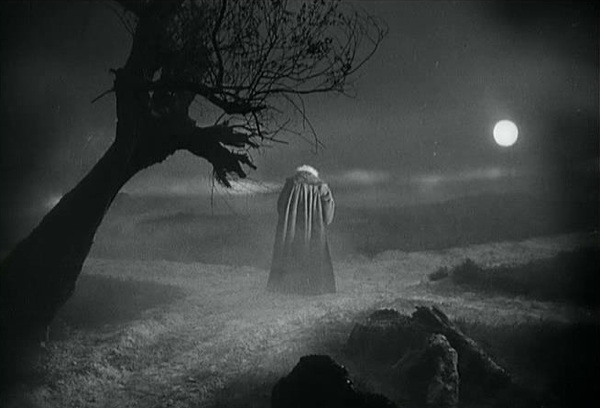 สำหรับสไตล์การออกแบบ German Expressionist เป็นการสื่อแทนอารมณ์ความรู้สึกของเรื่องราว/ตัวละคร มันอาจมีรูปลักษณ์บิดเบี้ยวเกินจริงไม่ได้สัดส่วน นี่ไม่จำเป็นต้องกับการออกแบบเมืองเท่านั้นนะครับ อย่างช็อตนี้ขณะที่ Faust กำลังจะเรียกปีศาจ เขาอยู่ระหว่างทางแยก 4 แพร่ง ระหว่างพระจันทร์กับความมืด (ต้นไม้ที่มีแต่กิ่งก้าน คือจิตใจที่ไร้ใบสดชื่น)