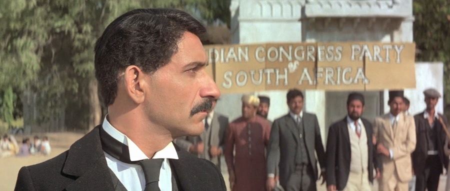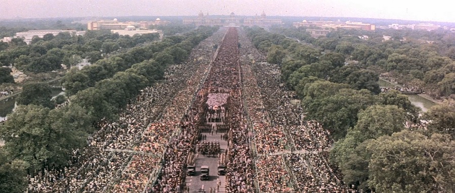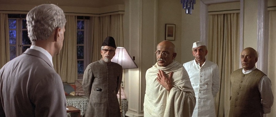 Gandhi (1982) เป็นภาพยนตร์ที่ผมถือว่าใช้ประโยชน์จากความยาวของภาพ (2.39:1) ได้ยอดเยี่ยมมากๆเรื่องหนึ่ง นอกจากทิวทัศน์พื้นหลังสวยๆ ยังพบเห็นการจัดวางตำแหน่ง องค์ประกอบภาพ แบ่งแยกฝักฝ่ายอย่างชัดเจน