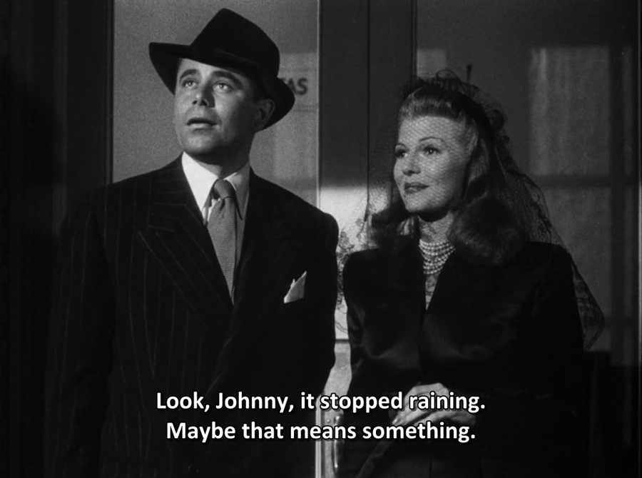 ความตายของ Ballin ทำให้ Johnny กลายเป็นผู้รับมรดก รวมถึงครอบครองเป็นเจ้าของ Gilda แม้ว่าขณะนี้ฝนหยุดตก ราวกับจะสื่อถึงฟ้าสดใส เริ่มต้นชีวิตใหม่ แต่เธอสวมใส่ชุดสีดำ สร้อยมุกเต็มคอ พร้อมตาข่ายคลุมใบหน้า ล้วนเป็นการบอกใบ้หายนะติดตามมา หญิงสาวกำลังจะถูกพันธนาการ กักขังหน่วงเหนี่ยว กลายเป็นนกในกรงทอง ชีวิตหาได้สว่างสดใสดั่งนิมิตหมายหลังจดทะเบียนสมรส