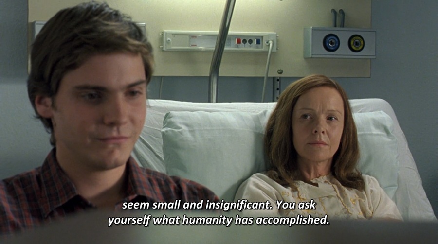 ก่อนหน้านี้ตอนต้นเรื่อง Alex ก็เคยจุดจรวด (Pioneer Rocket) พุ่งทะยานขึ้นท้องฟ้า แล้วกล้องเคลื่อนลงมา Time Skip จากเด็กเป็นผู้ใหญ่ ค.ศ. 1978 มาเป็น ค.ศ. 1989 … นี่ก็เป็นการอ้างอิงถึง 2001: A Space Odyssey (1968) เช่นเดียวกัน