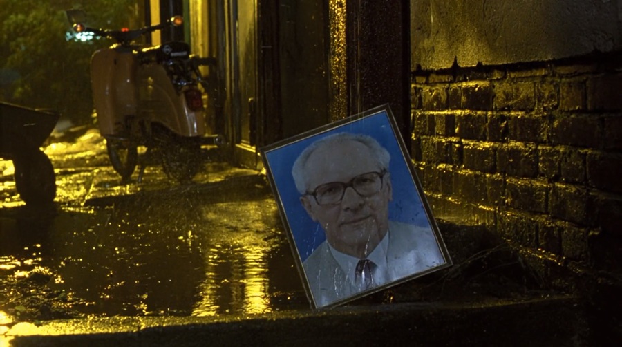 Alex นำวีดิโอม้วนสุดท้ายที่ฉายกำแพงเบอร์ลินพังทลาย พอดิบพอดีในวันที่เยอรมนีรวมประเทศ (German reunification) 3 ตุลาคม ค.ศ. 1990 ทำให้มีการจุดพลุ เฉลิมฉลอง แสงสีแดงสาดส่องเข้ามาในห้อง (ย้อนรอยตอนต้นเรื่องที่ผ้าแดงผืนใหญ่ ทำให้อพาร์ทเม้นท์อาบฉาบสีแดง) นี่เป็นการบอกใบ้ความตายของมารดา ก่อนเสียชีวิตสามวันถัดมา