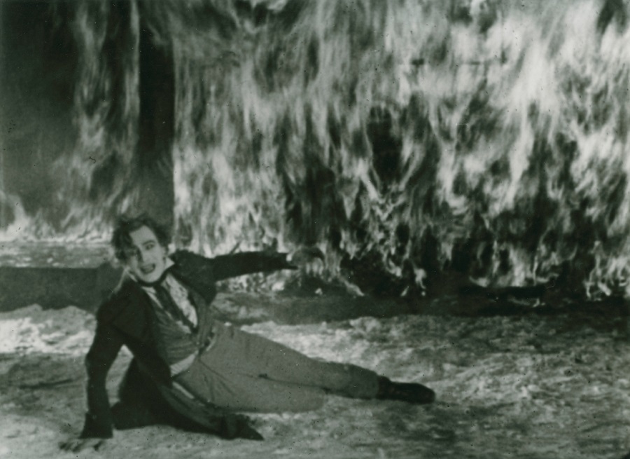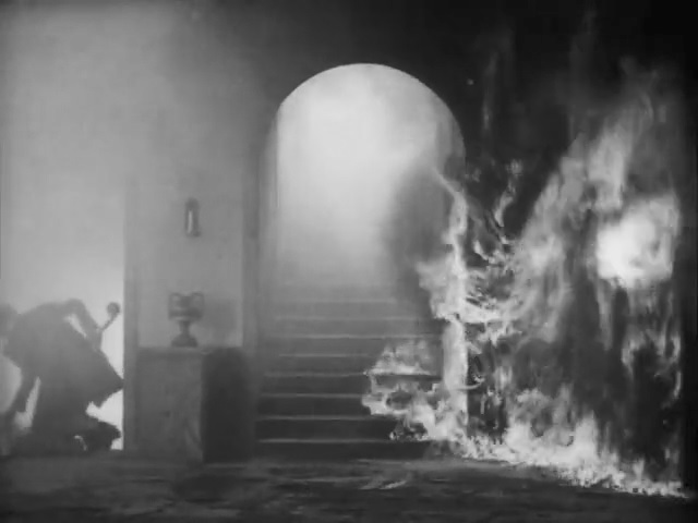 ขณะที่สภาพอากาศภายนอกกำลังหนาวเหน็บ หิมะตก แต่เปลวไฟอันลุ่มร้อนสามารถแผดเผาทำลายทุกสิ่งอย่างให้ราบเรียบเป็นหน้ากลอง … นี่เป็นฉากเสี่ยงตายที่ส่วนใหญ่นักแสดงเล่นเอง (สมัยนั้นยังไม่มีสตั๊นแมน) ให้ลองสังเกตลักษณะของเปลวไฟ ถูกจุดเป็นระนาบแนวยาวหันเข้าหากล้อง มีคำเรียกว่า ‘pyromaniacal glee’ ก็เพื่อให้สามารถควบคุมเพลิงได้โดยง่าย