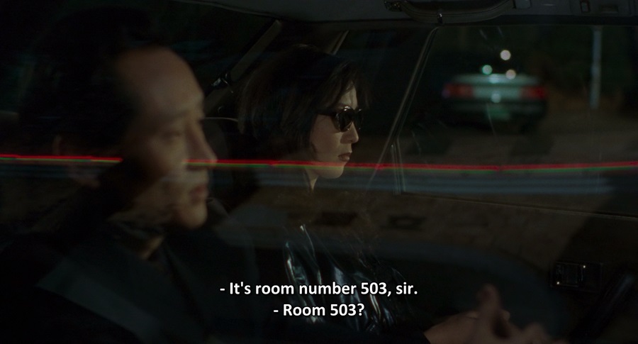 ภาพช็อตนี้ตอนก่อนที่ Bae Tae-gon จะส่งตัว Mi-ae ขึ้นไปบำเรอกาม Kim Yang-kil กล้องถ่ายภายนอกรถ กระจกสะท้อนเส้นแสงสีแดงลากยาวพานผ่านใบหน้า (ของทั้ง Bae Tae-go และคนขับ Mak-dong) … ผมยังครุ่นคิดไม่ออกว่าแฝงนัยยะอะไร แต่ดูเหมือนเส้นเชือกพันธการตัวละครไว้ ทำให้ไม่สามารถดิ้นหลบหนีโชคชะตา