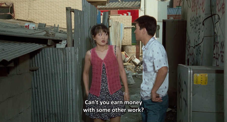 Mak-dong พบเจอน้องสาวเป็นบาร์โฮส (Hostess) แต่ปกปิดครอบครัวว่าทำงานโรงงาน ทั้งสองวิ่งไล่กันจากร้านมาจนถึงตรอกสลัม แสดงถึงชีวิตที่ไม่ได้เลิศหรู ต้องต่อสู้ดิ้นรน เงินทองไม่ได้หามาง่ายๆ ไม่ใช่ทุกคนจะสามารถอยู่สุขสบาย … การฉายภาพสลัม ก็เพื่อนำเสนออีกด้านของสังคมเมือง ตรงกันข้ามกับอพาร์ทเม้นท์สูงใหญ่ (พบเห็นตอนไปขายไข่กับน้องชายก่อนหน้านี้) ย่อมต้องมีถิ่นที่อยู่ของผู้ยากไร้