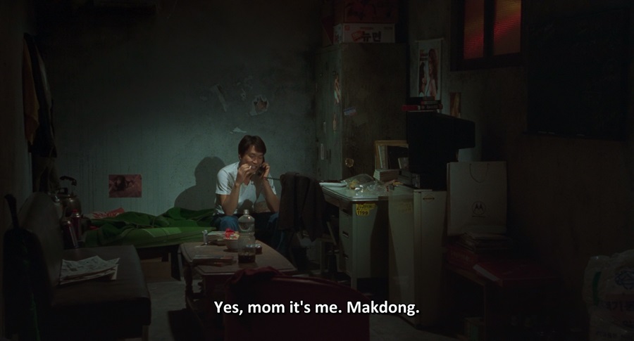 แม้เพิ่งทำงานได้ไม่กี่วัน Mak-dong ก็แสดงอาการคิดบ้านเสียแล้ว หยิบรูปภาพในกระเป๋าสตางค์ขึ้นมาเชยชม โทรศัพท์พูดคุยกับมารดา และในห้องนอนโกโรโกโสแห่งนี้ สังเกตว่าเตียงนอนยังมีสีเขียว (หลับฝันถึงเจ้าปลาสีเขียว?) … นี่แสดงให้เห็นวิถีชนบทเข้าสู่เมือง ที่ต้องทนอยู่ตัวคนเดียว เหงาหงอย เปล่าเปลี่ยว โหยหาบางสิ่งอย่างสำหรับพึ่งพักพิง