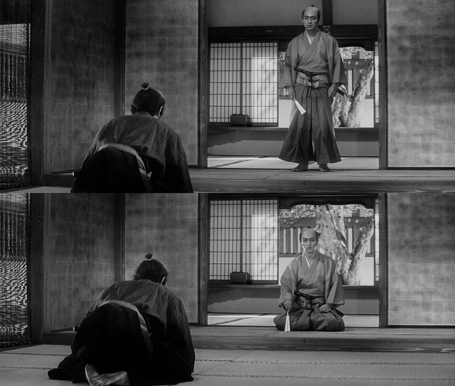 เช่นเดียวกันกับการยืนนั่ง เล่นพัด ตำแหน่งกล้อง ล้วนสะท้อนอารมณ์ความรู้สึกของตัวละครขณะนั้นๆออกมา, ช็อตนี้ Saitō Kageyu เริ่มต้นยืนด้วยความหงุดงิดคับข้อง ซึ่งเมื่อ Tsugumo Hanshirō ยินยอมรับฟังเรื่องเล่าจึงยอมนั่งลงเพื่อสงบสติอารมณ์