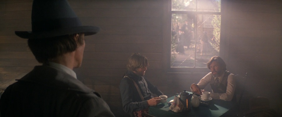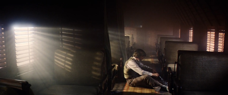 ฉากภายในของหนังต้องชมเลยว่างดงามมากๆ นั่นเพราะมักมีความฟุ้งจากฝุ่นควัน ทำให้แสงดูสลัวๆ ขมุกขมัวๆ ภาพออกมาดูหยาบกระด้าง สะท้อนสภาวะทางจิตใจของตัวละคร Jim Averill ไม่ว่าขณะไหนล้วนเต็มไปด้วยความหมองหม่น ไร้สีสัน ขาดชีวิตชีวา อย่างฉากนี้แสงจากภายนอกลอดผ่านบานเกล็ด มีบางสิ่งอย่างควบคุมครอบงำจิตวิญญาณของเขาไว้ ไม่สามารถดิ้นหลุดพ้นพันธการ นกในกรงขัง