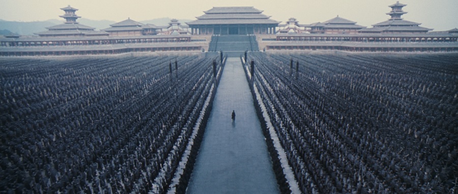 ภาพยนตร์แนวมหากาพย์ (Epic) ที่มีฉากสงคราม แทบทั้งนั้นจะต้องมีภาพมุมสูง ‘Bird’s Eye View’ ถ่ายจากโดรน เครน หรือเฮลิคอปเตอร์ เพื่อให้ผู้ชมพบเห็นความยิ่งใหญ่อลังการ ตื่นตาตื่นใจ แต่ไม่ใช่สำหรับ Hero (2002) ที่จะเริ่มจากช็อตระดับแนวสายตา ให้ตัวประกอบยืนเรียงแถวจนเต็มความกว้างของภาพแล้วค่อยๆกรีธาทัพเข้าหาหน้ากล้อง ส่วนภาพมุมกว้างก็ยังคงถ่ายจากภาคพื้นดิน พบเห็นความเป็นระเบียบเรียงแถว ไกลสุดลูกหูลูกตาเช่นเดียวกัน