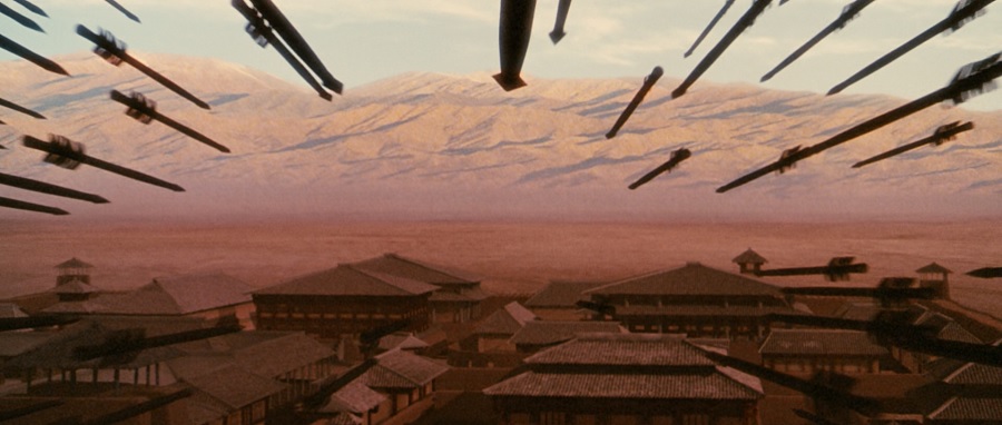 แต่หนังก็สร้างความอึ้งทึ่งให้ผู้ชม ด้วยการนำเสนอมุมกล้อง ‘Arrow’s Eye View’ ติดตามลูกธนูที่ถูกยิงออกคันสาย พุ่งตรงไปยังเมืองหลวงของรัฐจ้าว ทะลุผ่านหลังคาเข้าไปภายใน เข่นฆ่านักศึกษา ประชาชน ผู้คนตกตายจากห่าธนูมากมายนับไม่ถ้วน